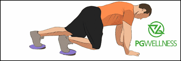 High Plank [Mountain Climber, Gliders]: An exercise, performed with a pair of gliders, that will help enhance core strength and coordination, improve hip mobility and shoulder stability, and boost cardiovascular conditioning.